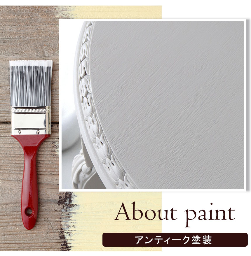 ![]() 塗装はアンティーク塗装でシャビーに 刷毛目をあえて残すことで生まれる、表情豊かなアンティーク塗装。 均一でない塗りの風合いが、まるで長年愛用してきたかのような温もりを漂わせます。 フレンチテイストの空間に、深みと個性を添える仕上げです。