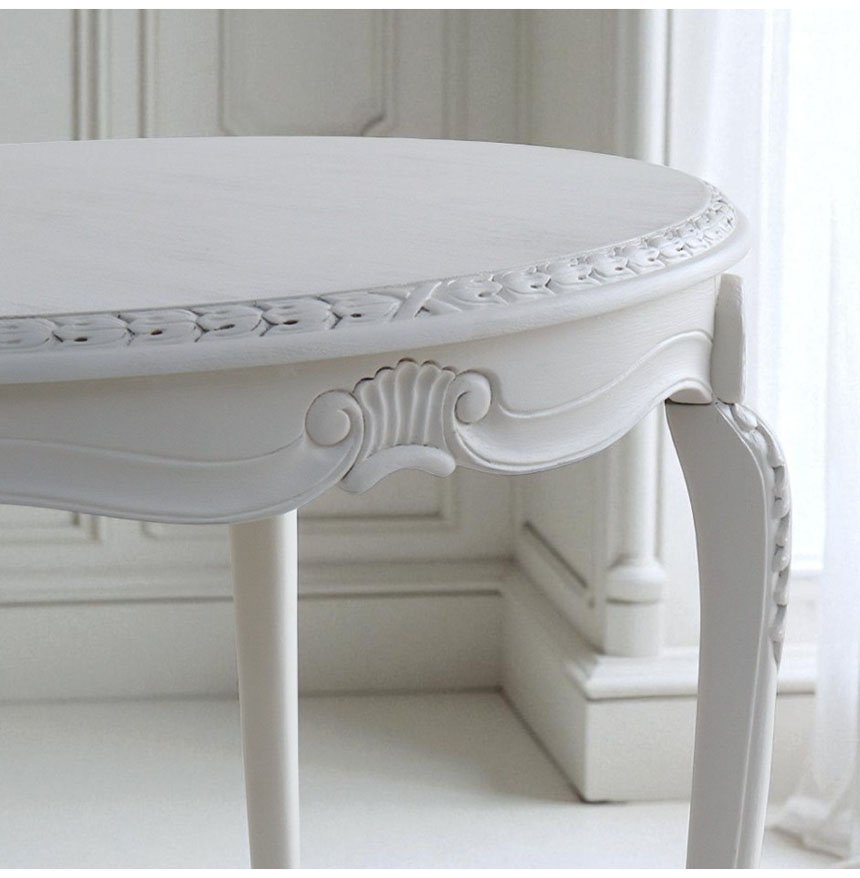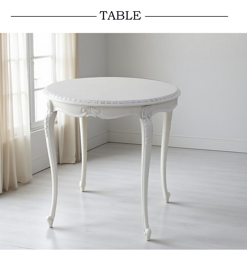 ![]() 小さな空間にも映える、優美なラウンドテーブル 幅78cmのラウンドテーブルは、ダイニングとしてはもちろん、 窓辺でティータイムを楽しむカフェテーブルや、 季節の花や雑貨を飾るディスプレイ台としても活躍してくれそう。 限られたスペースにも収まりやすく、猫脚の優美なフォルムと、 シャビー感を残した塗装が、お部屋をやわらかく上品な雰囲気に演出します。