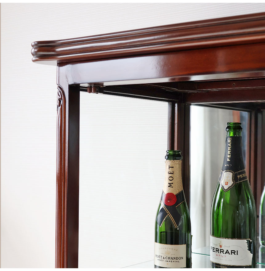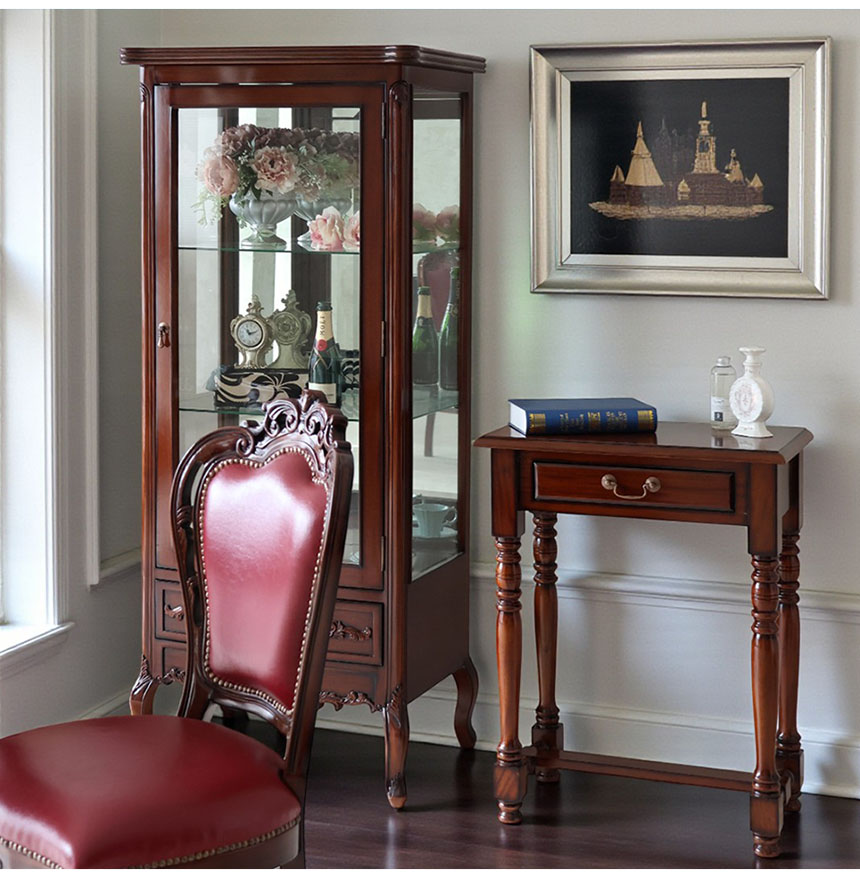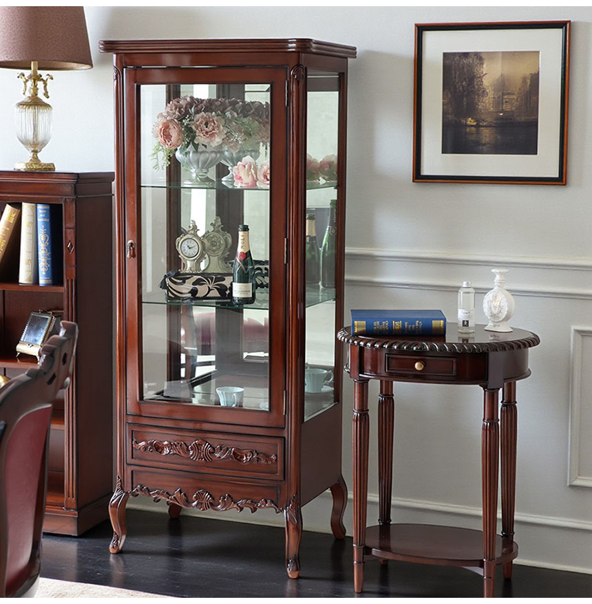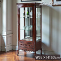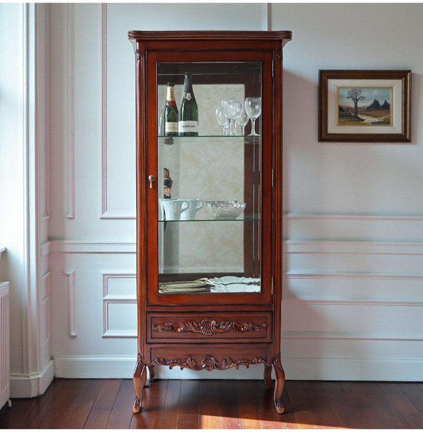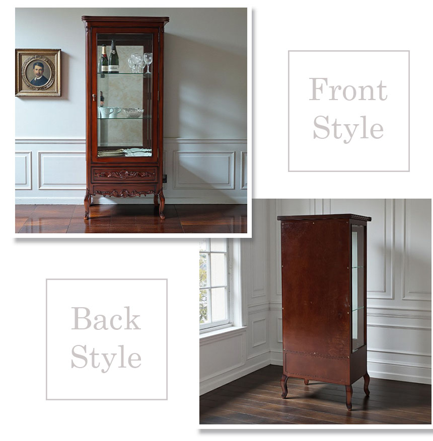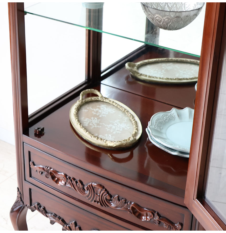 幅68.5cmとスリムながら、重厚感のあるマリナカッシーリの片開きショーケース。 マホガニー特有の赤みを帯びたブラウンと艶やかな光沢。そして、繊細な彫刻入りの猫脚が美しい輸入家具らしいフォルムが魅力的。 ガラス扉の内部には背面ミラーを備え、グラスやボトルなどを立体的かつ明るくディスプレイしてくれます。 下部には1杯の引き出し付きで、クロスやカトラリーなどの収納にも便利。 リビングやダイニングのコーナーを、ワンランク上の空間に演出してみては?