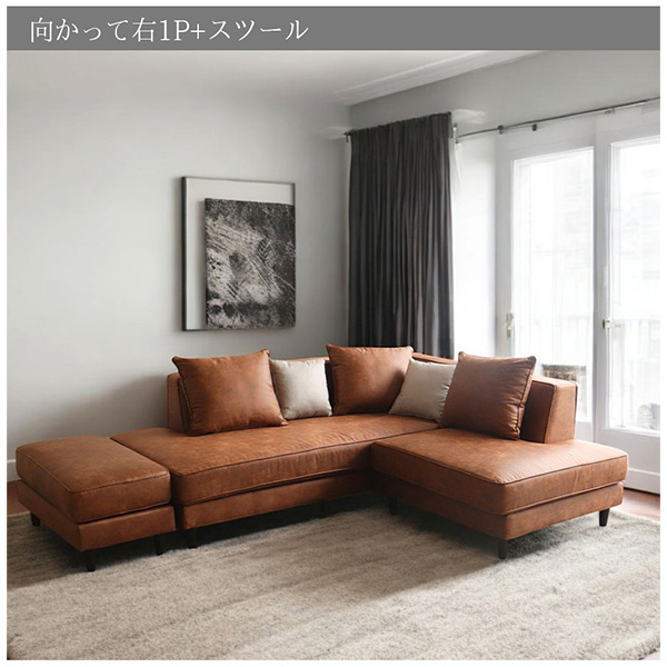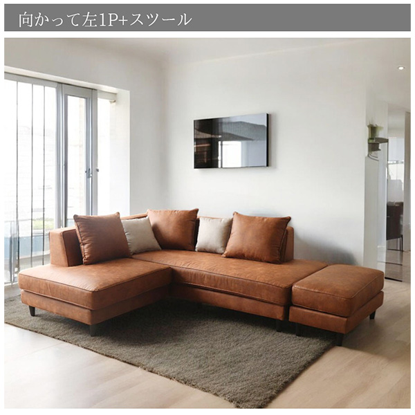 お好みに合わせて選べる、2種類のタイプ こちらのソファは、「向かって右1P+スツール」と、 「向かって左1P+スツール」の2タイプでご用意。 お部屋のレイアウトや使い勝手に合わせて、最適なスタイルをお選びいただけます。