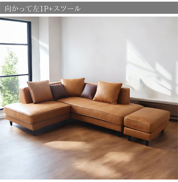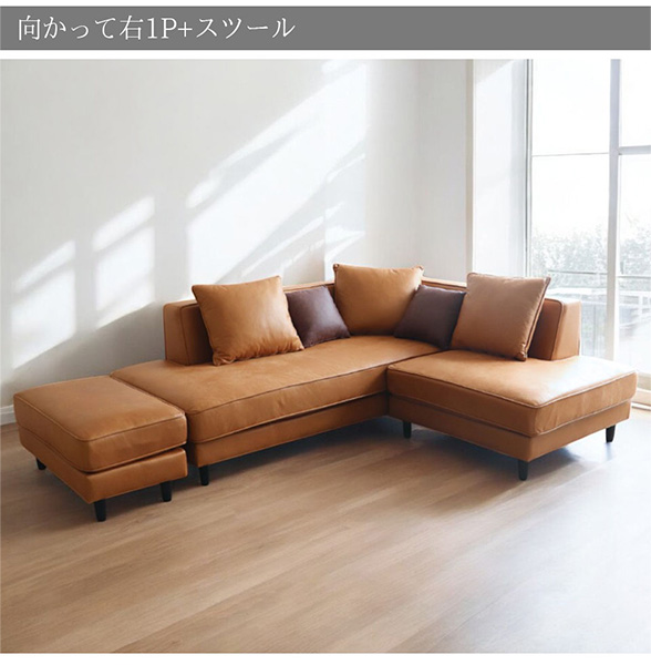 お好みに合わせて選べる、2種類のタイプ こちらのソファは、「向かって右1P+スツール」と、 「向かって左1P+スツール」の2タイプでご用意。 お部屋のレイアウトや使い勝手に合わせて、最適なスタイルをお選びいただけます。