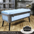 長年使い込んだような深みのあるルックス インダストリアルでヴィンテージ感のあるデザインシリーズ 収納ボックスとしても使える便利なロングスツール。 少しかすれたような色のベロア生地はアンティークな雰囲気を演出します。