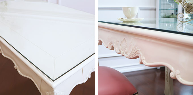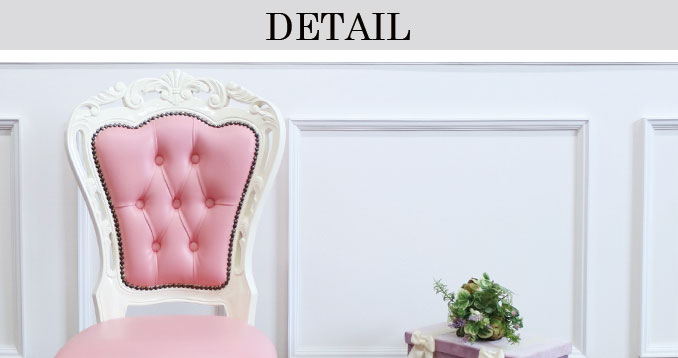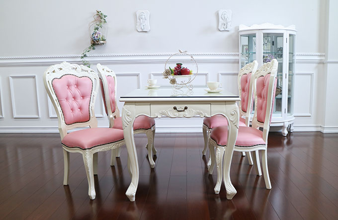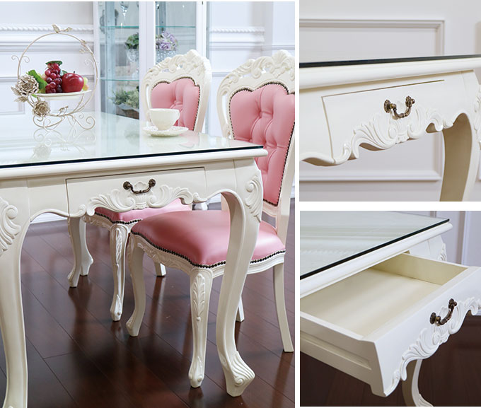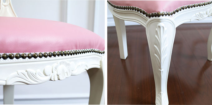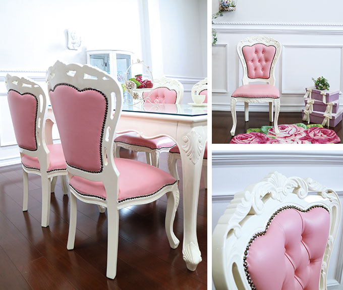 当店人気のマホガニー家具の中でも定評のあるベネシアシリーズからゴージャスでキュートなダイニングセットができました。ピンクレザーってあるようでなかったので、せっかくなら思いっきりプリンセスにしたく、ピンクのカラーも上品さも持ちつつ、華やかな印象になるPVCレザーを使用しました。ブラウンとはまた違ったヨーロピアンデザインのチェアのデザインにし、姫家具らしさを引き立てて作ってあります。マホガニー材でも有能な工場で厳選された素材を作っているベネシアシリーズは輸入家具の中でも安定した丁寧な仕上がりで作られております。だから、輸入家具でも「品質重視」の方にはお勧めの逸品です。※【必ずお読みください】こちらの商品は主に輸入家具となっており、海外での生産となります。また、ヨーロッパ・ドバイ・アメリカなどといった海外向けに作られている商品となります。ほとんどが手作り・手塗装で制作されております。一点一点が手作業のため、塗装・仕上がりには個体差がございます。弊社での検品を行い、修正できる部分は修正してからの発送をしておりますが、アンティーク塗装仕上げ(離れると見えない程度)となっている個所がございますこと、予めご理解・ご了承の上、お買い求めください。