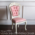 当店人気のマホガニー家具「VENECHIA ベネシア」シリーズのダイニングチェアです。あるようでなかったピンクレザーで思いっきりプリンセスにしたく、上品さも持ちつつ華やかな印象になるPVCレザーを使用しました。姫家具・ロココ家具らしさを引き立てて作りました。マホガニー材でも有能な工場で厳選された素材を作っているベネシアシリーズは、輸入家具の中でも安定した丁寧な仕上がりで作られております。輸入家具でも「品質重視」の方にはお勧めの逸品です。
