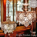 エレガントなレース模様のシェードが目を引く一灯タイプのシャンデリア。お部屋をおしゃれに彩る大粒のガラスパーツとゴールドの組み合わせがラグジュアリーな空間を演出します。下から見上げたときの美しさも抜群で、まるで星のような美しい明かりを放ちます。見上げるたびに心がときめく、そんな魅力的な照明です。