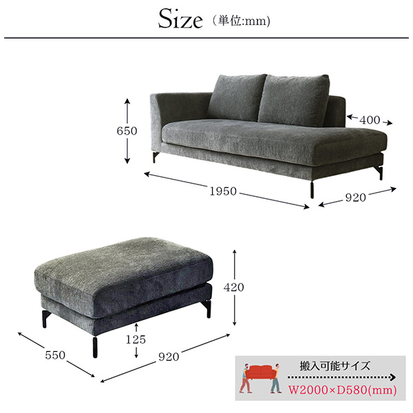 | サイズ | 3Pソファ:W1950×D920×H650 SH420(mm) オットマン:W920×D550×H420(mm) (その他詳細サイズは画像に記載しております) |