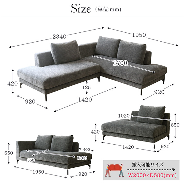 | サイズ | 全体:W2340×D1950×H650 SH420(mm) 3Pソファ:W1950×D920×H650 SH420(mm) 2ソファ:W1420×D920×H650 SH420(mm) (その他詳細サイズは画像に記載しております) |