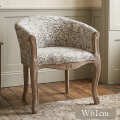 高級感のあるグレーの「いちご泥棒」ジャガード織を贅沢にまとった、気品漂うアームチェア。 背もたれから肘掛けへと流れるようにつながるやわらかなフォルムに、フレンチテイストの曲線脚とシャビーシックな天然木の風合いが調和し、置くだけで空間を上品に彩ります。 前面のボタン締めがさりげないアクセントとなり、コンパクトながら印象的な佇まいに。 幅約61cmの取り入れやすいサイズで、玄関や寝室、書斎など、さまざまな空間に自然と溶け込みます。