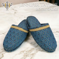 ◆Hamtonシリーズ。薄いネイビーカラーとクジャクの羽のような模様に金色の糸を使用したジャガード織りがシックな雰囲気なスリッパです。数量限定でなくなり次第、終了です。◆Jennifer Taylor社製の生地を使用した、高級感漂うユニセックスのルームシューズ。◆履いているだけで、エレガントな気分になれそう。◆自宅用にはもちろん、ご家族、お客様用にもおすすめです。◆裏底は、スウェード調の生地を張り、真ん中に合成皮革のすべり止めつきの為、歩いているときにペタペタと音がならない静音仕上げとなっております。【履きやすさも考えられたデザイン】◆男女兼用のシンプルなデザイン。横幅もゆったりしています。(26cm以上の方はかかとが少し出ます。)*使用感には、個人差があります