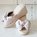 すらりと美脚を演出するこだわりの8cmヒール。大きな三重のクログランリボンがとってもゴージャスでエレガント。さらりとした履き心地で1年を通して快適にお使いいただけます。「ヒールを履いて学校に行ったらスリッパに履き替えた途端におしゃれ度が…。」「家でもおしゃれでいたい。」なんて思われていた方にピッタリの女性の希望を叶えたルームシューズです。厚底タイプになっているので長時間履いても疲れにくい設計となっております。前部分も厚みを出すことにより、緩めの角度となり、脚に負担がかからないように配慮されていて安心。裏底は静音設計のソールで室内でもパタパタと大きな音が響かず静かな仕様です。入学式や卒業式、お受験などの学校行事はもちろん、サロン様やエステティシャンの方にも人気です。
