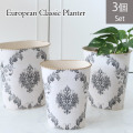 アイデア次第で使い方いろいろ! ブリキ製プランターボックス 3Pセット ラウンド ダマスク柄がおしゃれなブリキ製のボックス3個セットです。 使い勝手のいいラウンドサイズ。 インテリアグリーンや造花を飾ったり、小物入れやダストボックスとしても使える万能アイテムです。