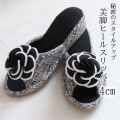 室内でもスタイルよく見せたい貴方にピッタリ。このスリッパはこのヒールが特徴!ヒールを履いて学校に行ったら、普通のスリッパに履き替えた途端あらら…。おしゃれ感とスタイルが…。なんて経験はございませんか?室内でもすらりとスタイルよく見える効果が期待できるヒールタイプ。カメリアをあしらったかわいいデザインが特徴です。ブラック+ホワイトのシックな色合いのツイード生地なので、参観などのフォーマル時にもおすすめ。