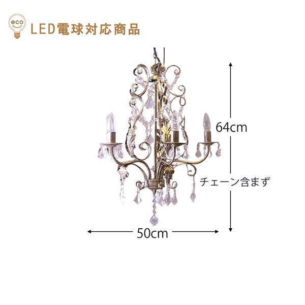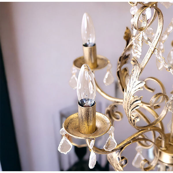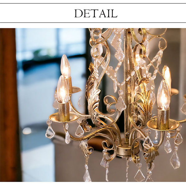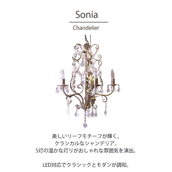 ロマンティックな照明で癒しの空間を クリスタルガラス シャンデリア 5灯(ソニア) 輝くリーフモチーフとアームが美しく華やかなシャンデリア。 5灯の温かなダークゴールドがおしゃれな雰囲気を演出します。 シーリングタイプなので取り付けも簡単。 コンパクトだけどしっかり5灯の明かりを持ったソニア。 寝室や、ダイニングテーブルの上への設置にもおすすめです。
