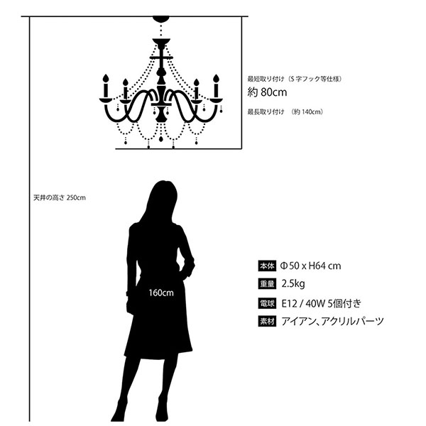 | 規格・付属 | E12 40W(水雷型) 電球5個付き(最大40Wまで対応) E12口径であればLEDは全てお使いいただけます。 水雷型が付属の白熱球と同じ見た目でオススメです。 |