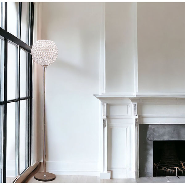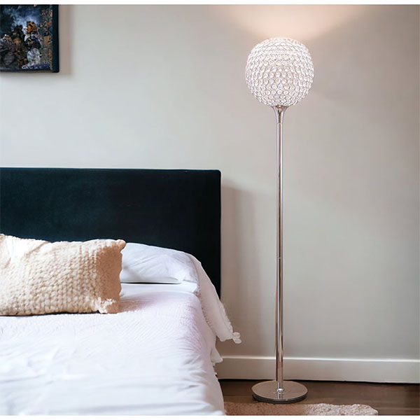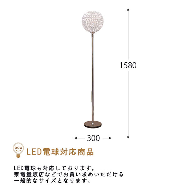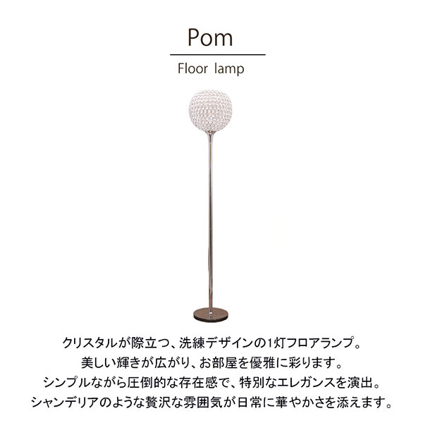 ロマンティックな照明で癒しの空間を クリスタルガラス フロアランプ 1灯(ポム) 華やかなクリスタルが煌めく、洗練されたデザインの1灯フロアランプ。 美しい輝きが広がり、部屋全体を優雅な雰囲気で包みます。 モダンなインテリアにも、クラシカルなインテリアにも 様々なてぃすとに合わせやすいのが魅力。。 ベッドサイドや、リビング、玄関などにピッタリ。