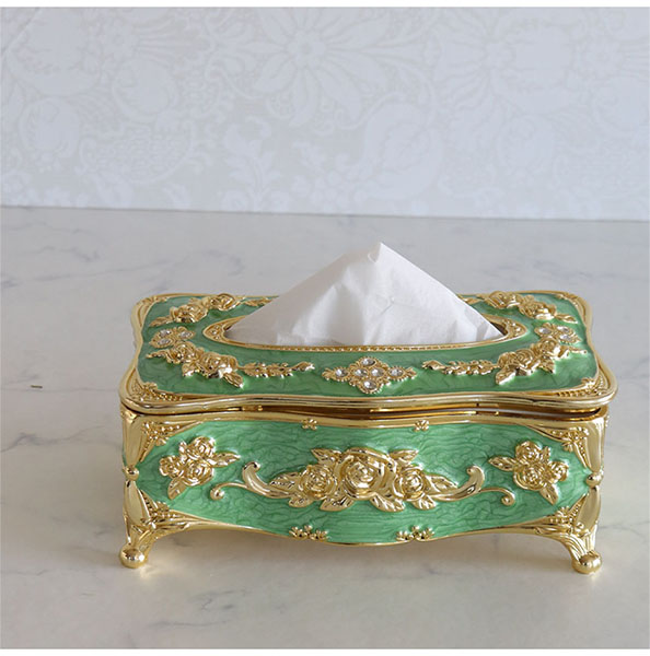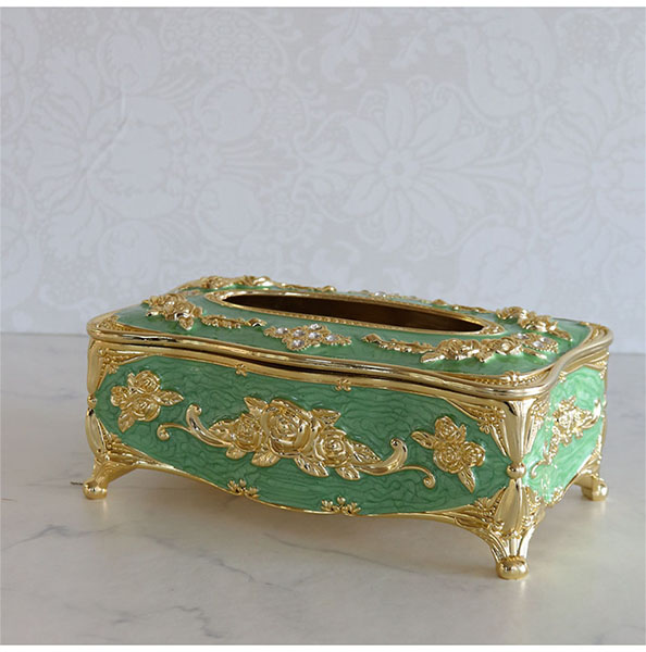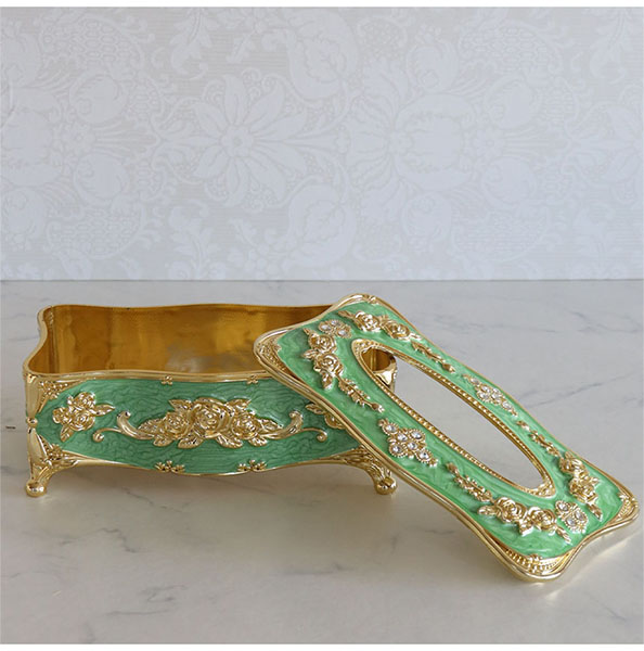 ロココ調のゴージャスな可愛さ シンデレラのティッシュケース(グリーン) 華やかなグリーンのティッシュボックスケース。 まるでお姫様のお城みたい。 市販のティッシュがラグジュアリーなインテリアに変身。 柔らかな色味で上品な雰囲気を演出。 ゴージャス&キュートなインテリアをお楽しみください。