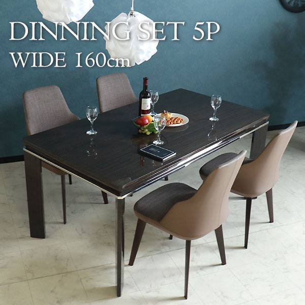 スタイリッシュで高級感あふれるデザイン HOBANG モダンダイニングセット5P スモークオーク ブラウン 鏡のような光沢感のあるグロス仕上げで美しいダイニングセット。 スモークオーク×ステンレス脚の調和がおしゃれでクールなデザインです。 重厚感あふれるテーブルに対して、チェアは軽やかなデザイン。 このコントラストが重たすぎずエレガントな印象を与えてくれます。