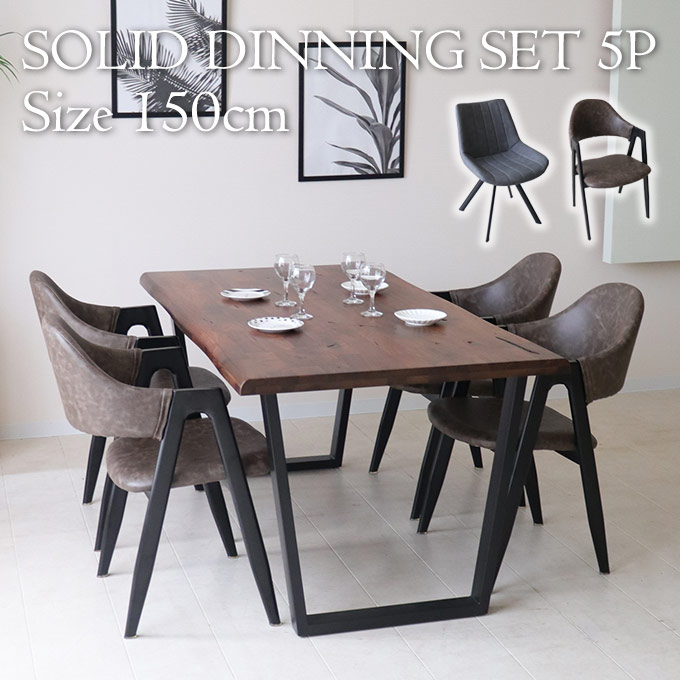 チェアを選べるモダンなダイニングセット ダイニングセット 5P ソリッド ウォールナット 4人用 天然のウォールナット無垢材の様々な表情を楽しむことができる 幅150cmのダイニングテーブルと、洗練されたデザインチェア4脚の5点セット。 太めのアイアンフレームが重厚かつスタイリッシュな空間を演出します。 組み合わせたチェアはテーブルとの相性抜群です。 家族や友人との大切な時間を過ごすダイニングスペース。 快適なチェアはその瞬間を更に特別なものに変えてくれます。 人を招きたくなる、そんな空間をお楽しみください。