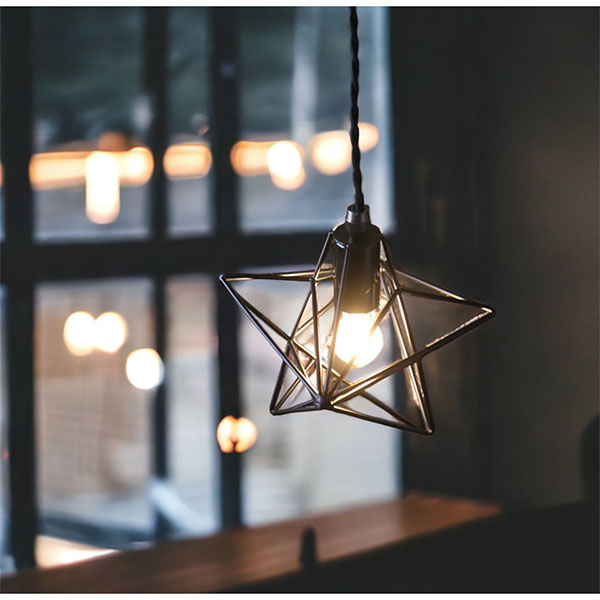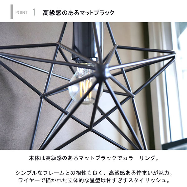 エキゾチックで幻想的な光と影を放つ ・・・ 【LED対応】ペンダントランプ Brillant-S ブリヤン・S(ブラック) 立体的な星形をワイヤーで描いたペンダントライト。 角度によって見え方が異なるワイヤーシェード。 壁に写る陰影も星のかたちになり、幻想的な空間に演出します。 ダクトレールなどにフレームを二つ並べたり、大きさ違いで飾ってみるのも素敵です。